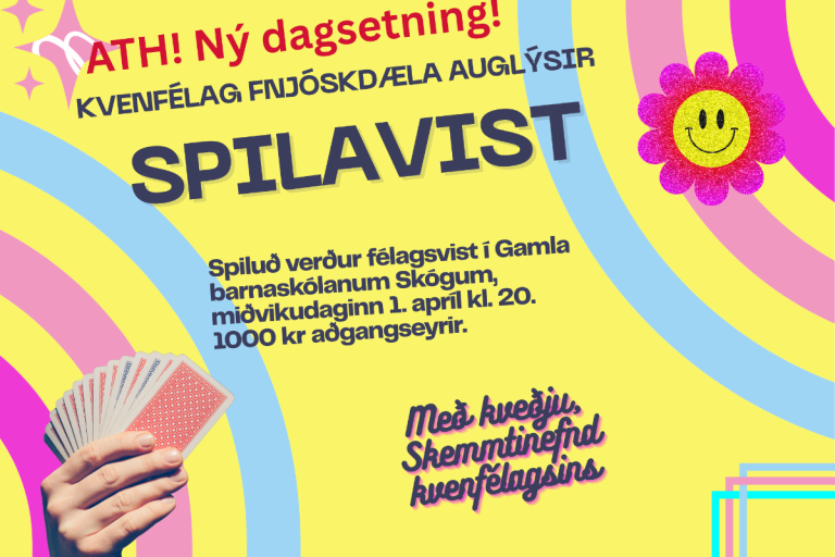 Kvenfélag Fnjóskdæla auglýsir spilavist. Spiluð verður félagsvist í Gamla barnaskólanum Skógum, Fnjóskadal, miðvikudaginn 1. apríl kl. 20. 1000 kr aðgangseyrir. Með kveðju, skemmtinefnd kvenfélagsins.